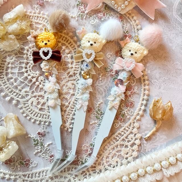 DECO Tweezers by Mari Original - - - - - - <商品概要> コラージュ、ステッカーの貼り剥がし、デコレーション、クラフト(手芸)、多肉植物などの園芸、押し花、写真や切手の取り扱い、模型の部品、ネイルパーツ、つけまつげを挟んだり…など、多用途に活躍するピンセットです。 “ 私ならでは “ になるよう、 オリジナルペンと同じパーツを使用し、「ペンとおそろいで持てる」デザインに仕上げました。 <商品内容> ピンセット(チャーム付き) 1本 直接販売のため格安価格設定です - - - - - - <重要:デザインについて> 掲載画像はオーダーの一例です。 お客様による色味のご指定をベースとし、「くま + ベロアリボン + お花などの本体装飾」の構成でお作りし、細かいパーツの形状や配置は、基本的に当方お任せとなります。 入れたいパーツや見せ方など、ご要望を事前に相談いただくことが可能です。 ご希望がある場合は事前にご連絡いただき、対応の可否をご確認ください。 ・選択肢に無いピンセット本体の色味指定 ・ベロアリボンの色味指定 ・ピンセットの先の形状(まっすぐ / 曲がり) ・その他あれば 事前にご相談がない場合は、指定いただいたデザインをベースに「当方お任せ」で制作いたしますのでご注意ください。 - - - - - - ※ 資材の入荷ロットによりピンセットの厚さ・質感・形状に差がある場合があります。日を改めて再度同じものをご指定いただいた際、以前と全く同じではない場合がある旨、ご了承ください。気になる方は事前に過去購入のお品の写真を送っていただければ現在の仕様を確認いたします。 ※ ペンとのお揃いデザインを楽しめるよう、かなりお安い価格設定にしています。この機会にぜひオリジナルペンもご一緒にオーダーいただけると嬉しいです♡