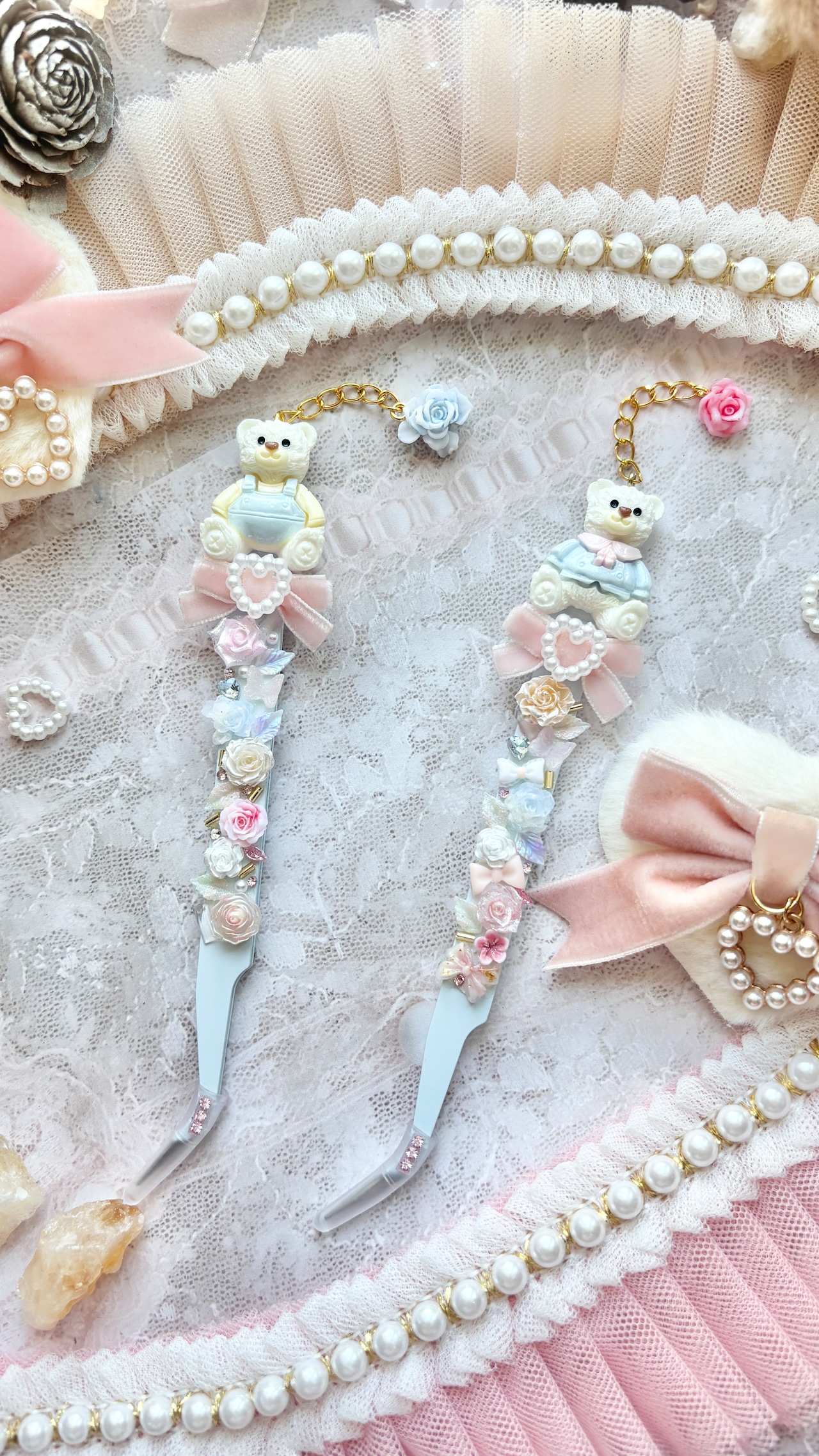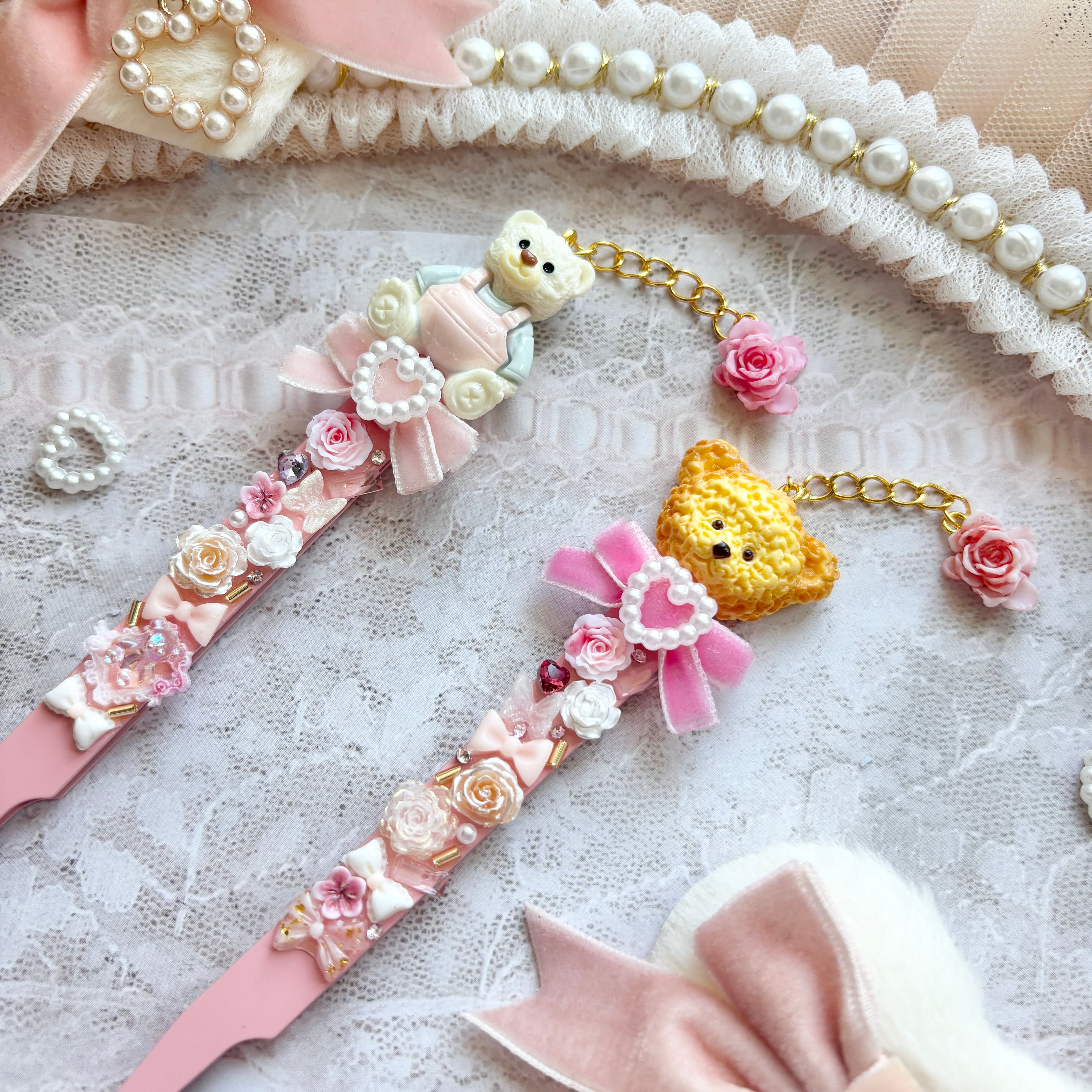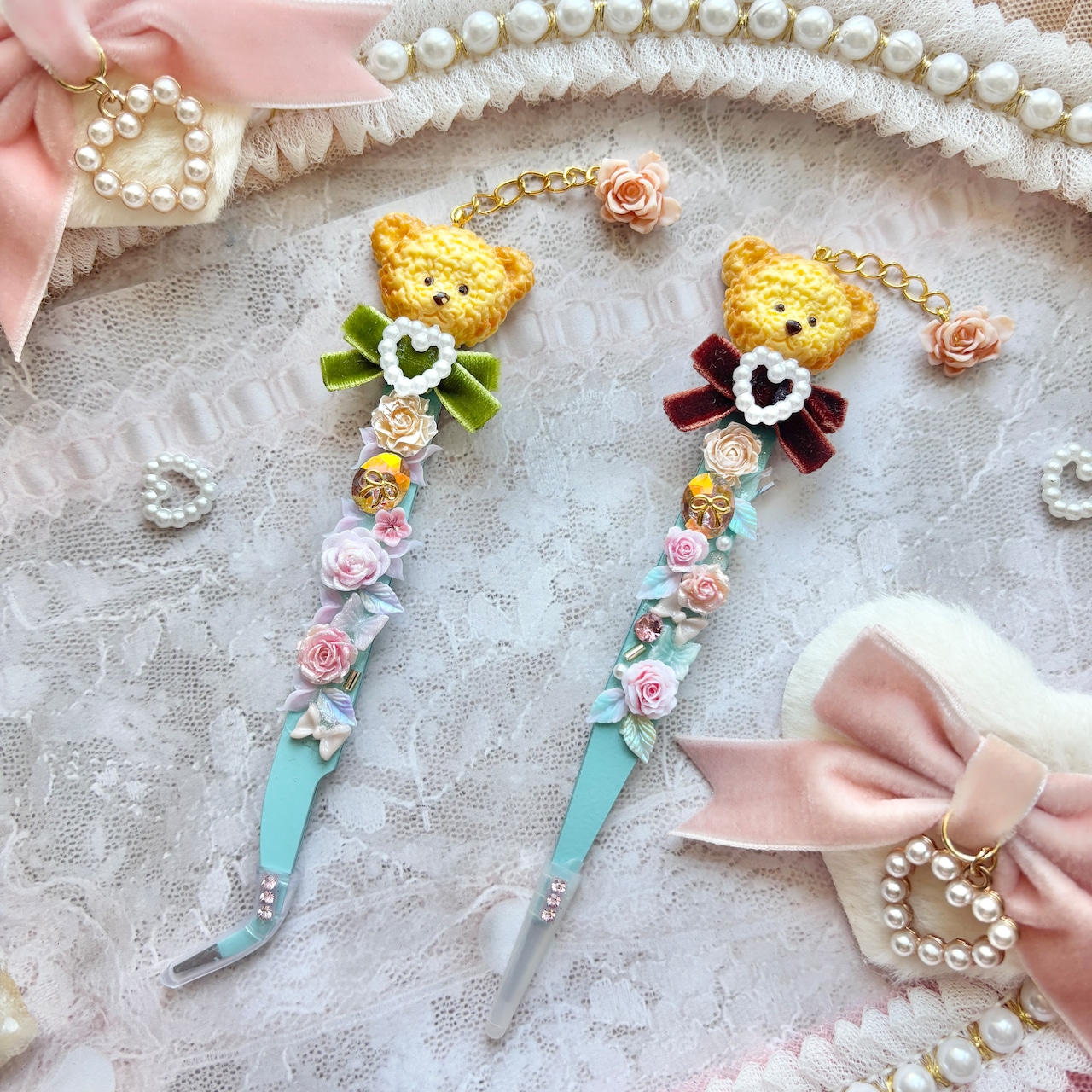 お客様による色味のご指定をベースとし、「くま + ベロアリボン + お花などの本体装飾」の構成でお作りし、細かいパーツの形状や配置は、基本的に当方お任せとなります。