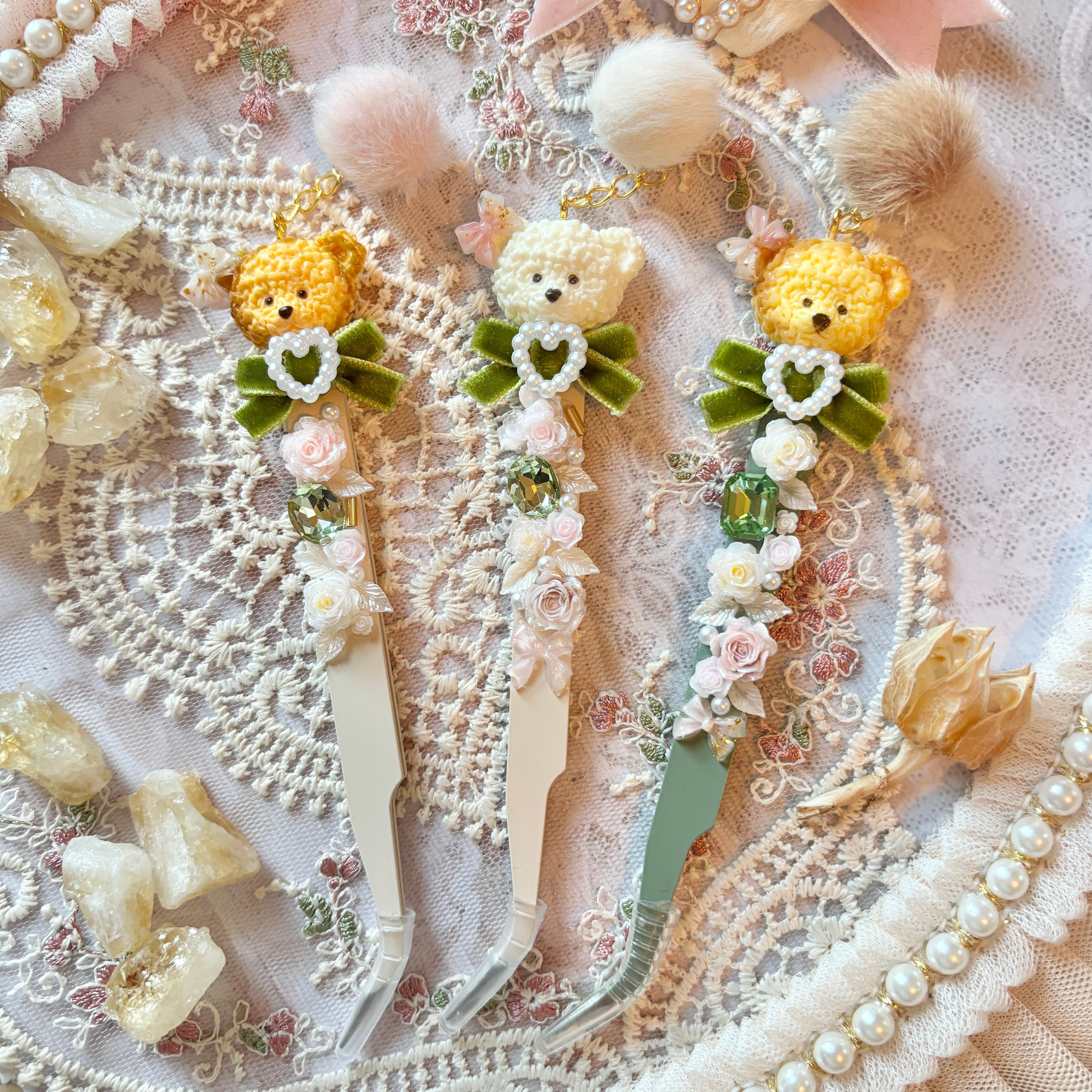 お客様による色味のご指定をベースとし、「くま + ベロアリボン + お花などの本体装飾」の構成でお作りし、細かいパーツの形状や配置は、基本的に当方お任せとなります。